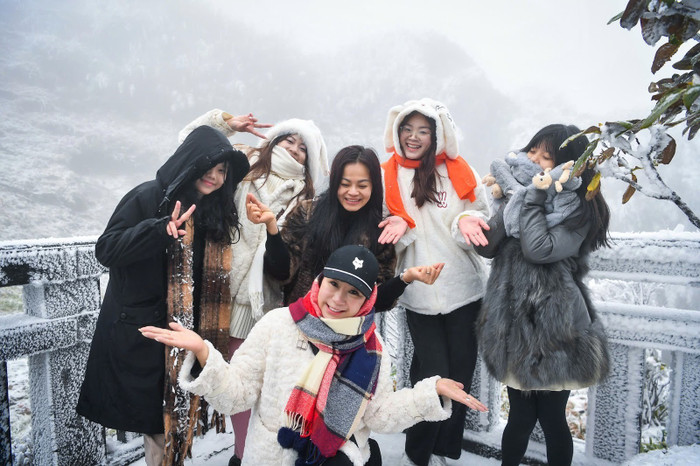 Du khách hào hứng “săn” băng tuyết hiếm có trên đỉnh Fansipan. Ảnh: Internet